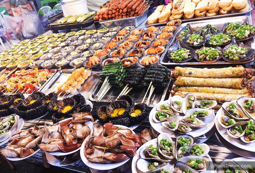 Nổi bật nhất ở chợ đêm Phú Quốc là các món nướng (phần lớn là hải sản) tự chọn. Mỗi sạp hàng sẽ bày cơ man mực, hàu mỡ hành, bánh mì muối ớt, bánh tráng nướng, trứng cút,.. Bạn chỉ việc chỉ và chọn, nhà hàng sẽ nướng và đem phần ăn nóng hổi tới tận bàn cho bạn.