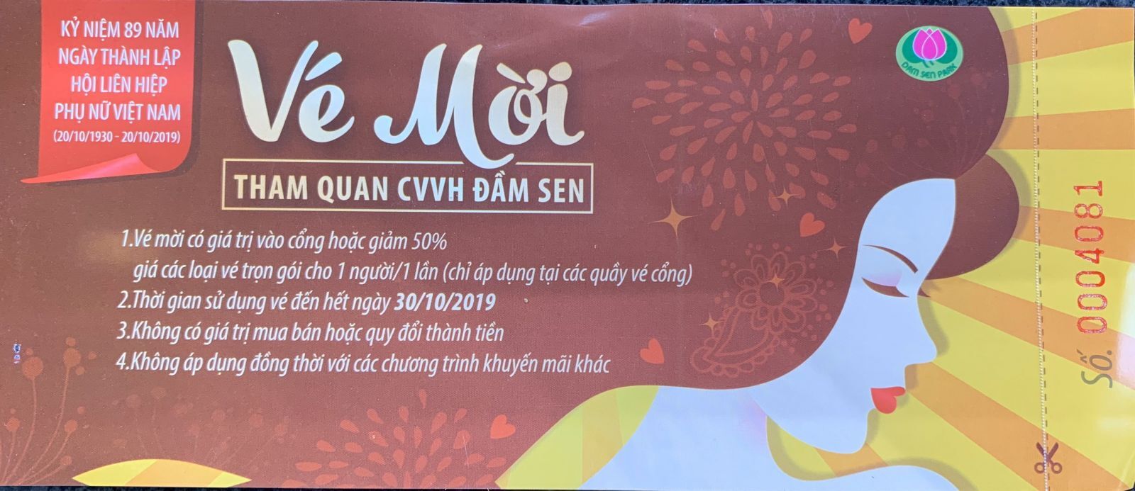 Miễn vé cổng , Giảm 50% giá vé trọn gói .Điều kiện áp dụng: dành cho phụ nữ có mặc trang phục áo dài, áo bà ba đến CVVH Đầm Sen vui chơi trong ngày 20/10/2019.
