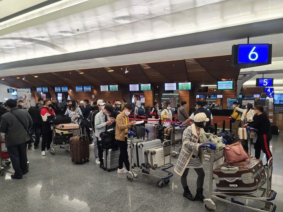 Hành khách xếp hàng làm thủ tục chuyến bay QH511 tại sân bay quốc tế Đào Viên, Đài Loan, Trung Quốc