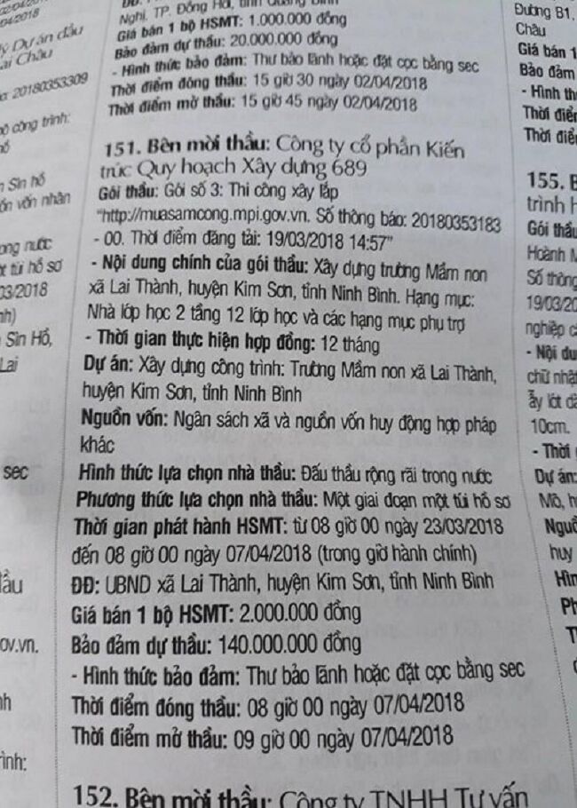 Theo tìm hiều của Phóng viên, Dự án xây dựng Trường mầm non xã Lai Thành (Kim Sơn, Ninh Bình) hạng mục nhà lớp học 2 tầng 12 lớp học và các hạng mục phụ trợ sẽ được tổ chức đấu thầu công khai, thông qua đó sẽ lựa chọn nhà thầu đủ điều kiện thực hiện dự án. Hồ sơ mời thầu của Dự án này chính thức được thông báo phát hành từ ngày 23/3 - 7/4/2018 tại UBND xã Lai Thành (Kim Sơn, Ninh Bình).