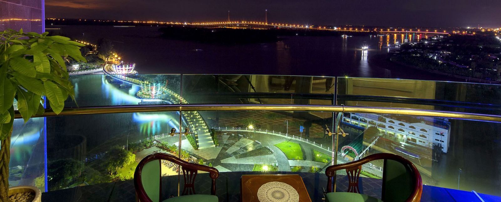 Một góc View đẹp của khách sạn nhìn xuống Cầu tình yêu, sông Hậu Giang và Cầu Cần Thơ với phong cảnh tuyệt đẹp vào ban đêm.