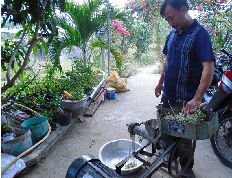 Rồi mình tận dụng xung quanh có sẵn cỏ rau rồi cộng thêm bột bắp, bột mì cho vào xoay để ra thành cám viên”. Sử dụng cám viên này, anh chỉ tốn một nửa chi phí so với việc dùng cám bao mua sẵn. Nguyên liệu ban đầu để chế tạo cám gồm 50% rau củ kết hợp 50% nguồn cám thô. Sau khi trộn chung, máy sẽ xay nhuyễn ra thành các viên cám có độ dài 1-2cm.