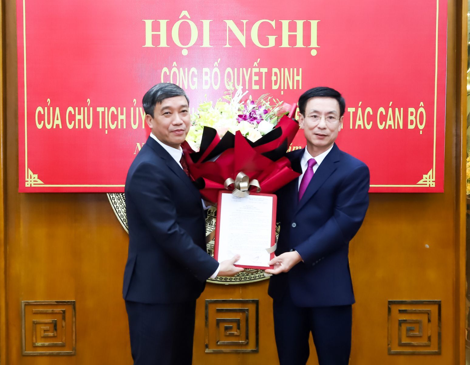 Chủ tịch UBND tỉnh Nam Định Phạm Đình Nghị trao quyết định tiếp nhận, bổ nhiệm cho tân Giám đốc Sở Kế hoạch và Đầu tư (bên trái)