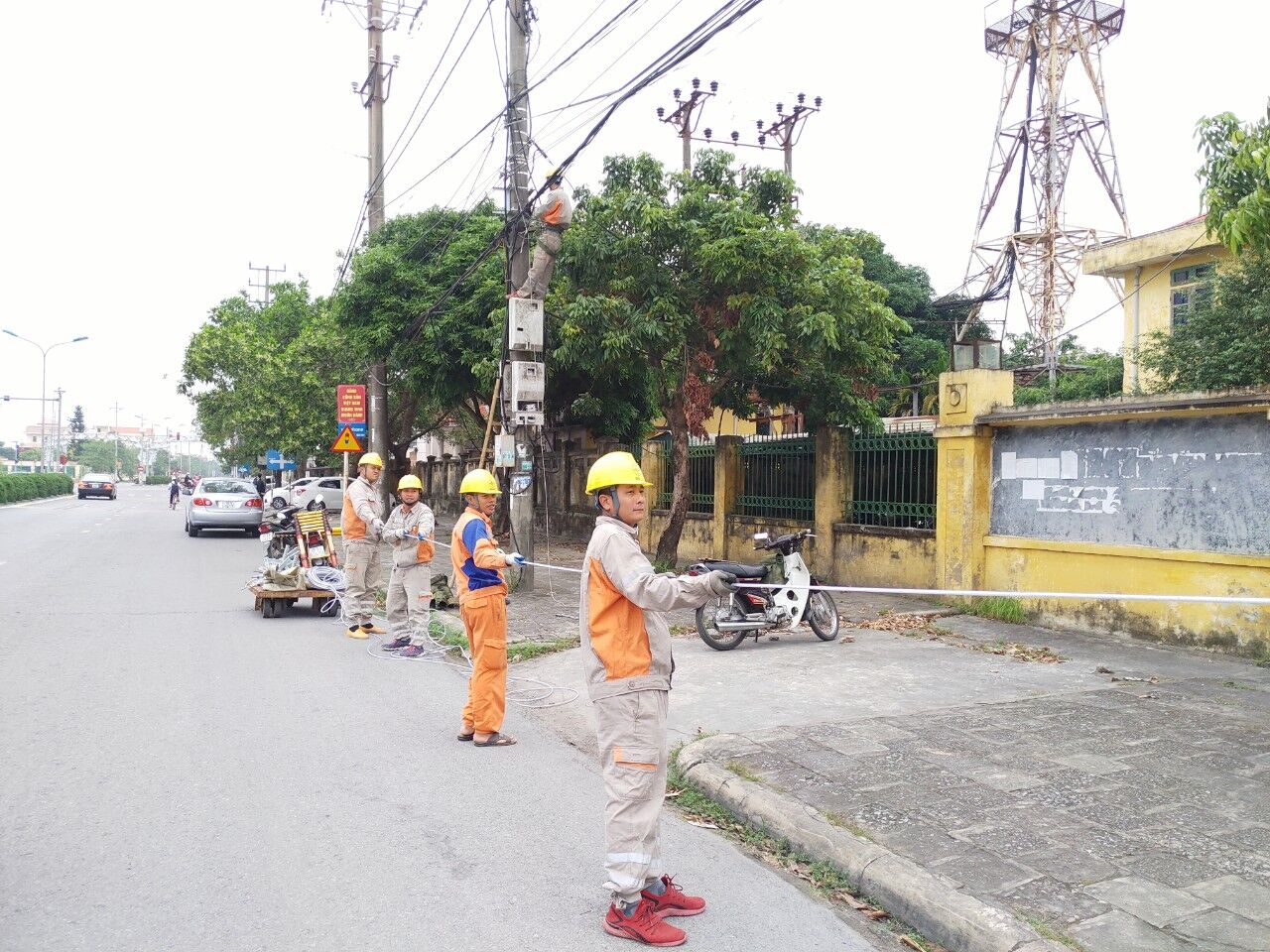 Công nhân Điện lực Nam Định kéo dây dưỡng thực hiện chỉnh trang lưới điện và hệ thống cáp viễn thông