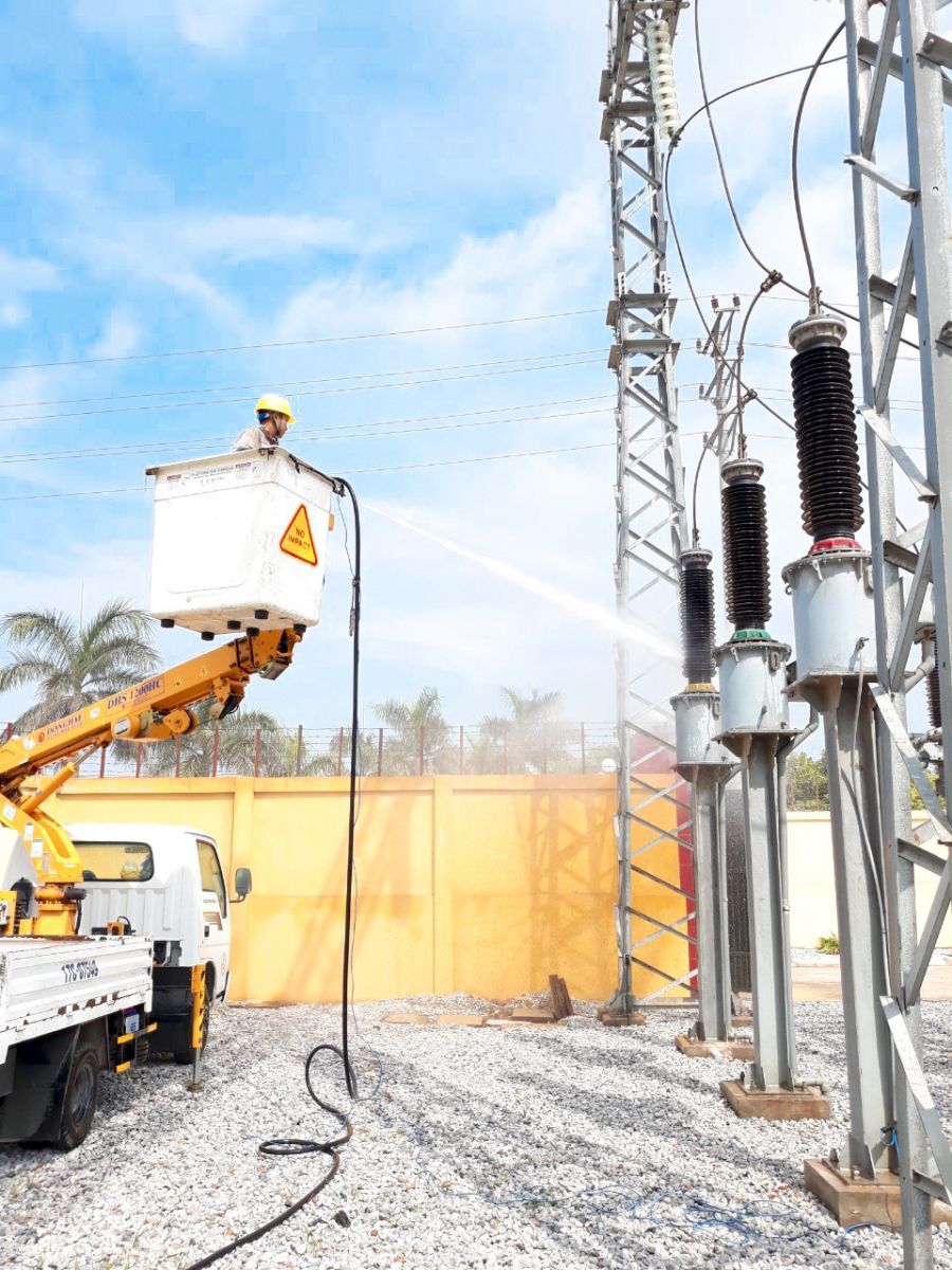 Công nhân trạm 110kV Tiền Hải vệ sinh cách điện đang mang điện bằng nước áp lực cao