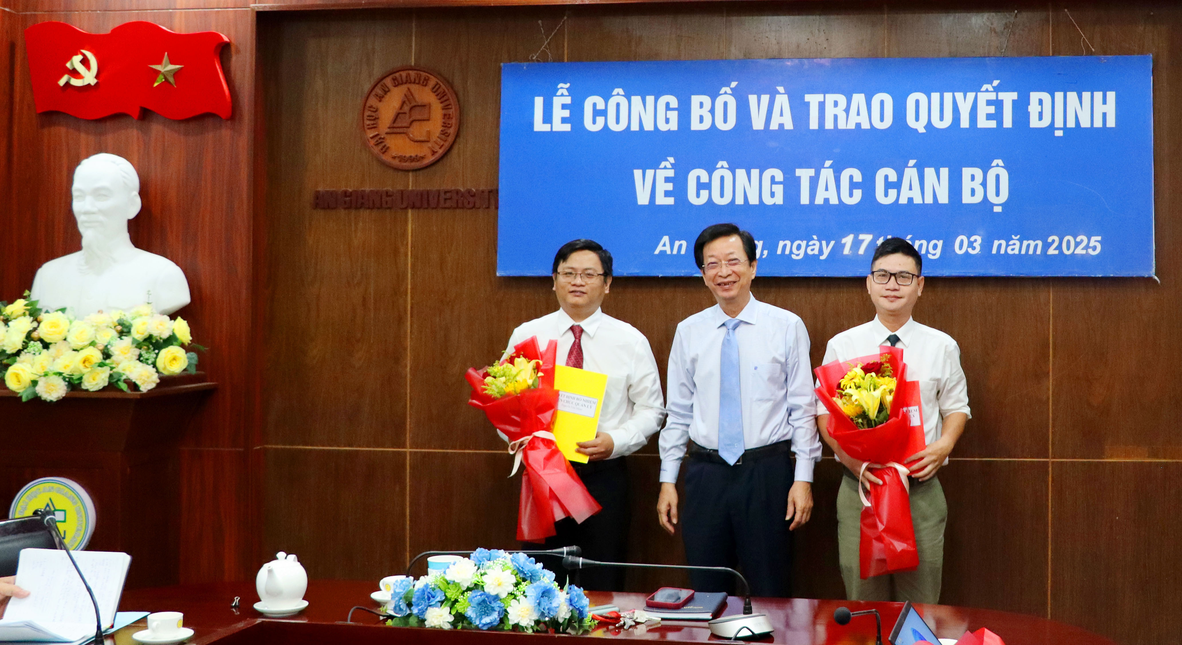 PGS.TS. Nguyễn Trung Thành (ngoài cùng bên phải) vinh dự được bổ nhiệm chức vụ Trưởng phòng Phòng Quản lý khoa học và Đào tạo sau đại học (nay là Phòng Khoa học & Công nghệ) Trường ĐH An Giang, ĐHQG-HCM.