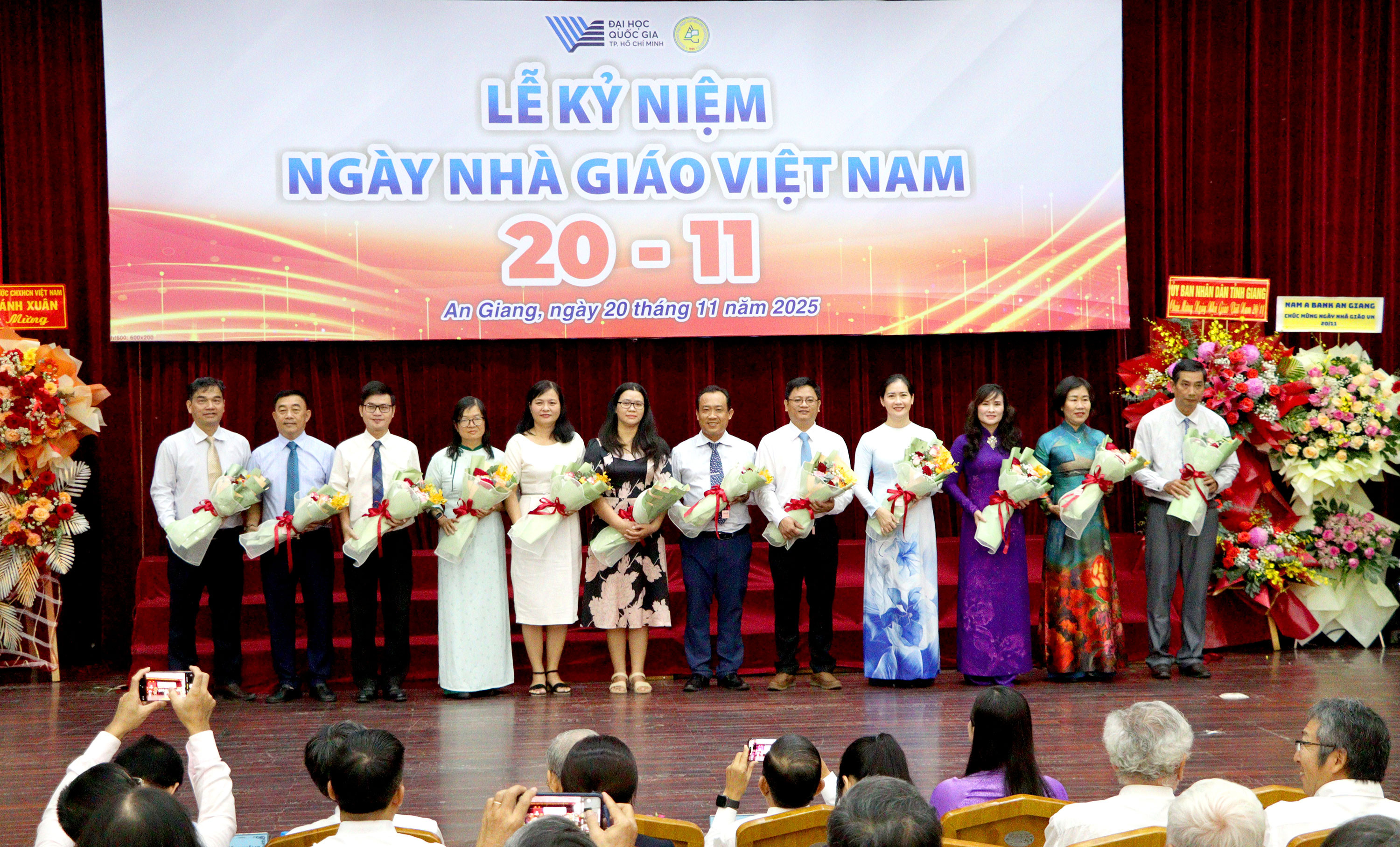 PGS.TS. Nguyễn Trung Thành (thứ 3 từ trái qua) và những nhà giáo tiêu biểu của Trường Đại học An Giang, ĐHQG – HCM được tôn vinh nhân dịp Kỷ niệm 43 năm Ngày Nhà giáo Việt Nam 20.11.2025.