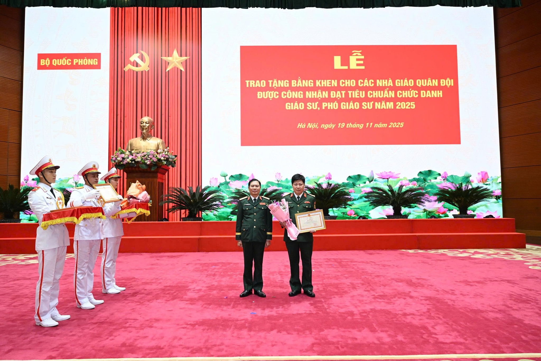 Đại tướng Nguyễn Tân Cương trao Bằng khen và tặng hoa chúc mừng Đại tá Nguyễn Đức Trung được công nhận đạt tiêu chuẩn chức danh Phó Giáo sư năm 2025.