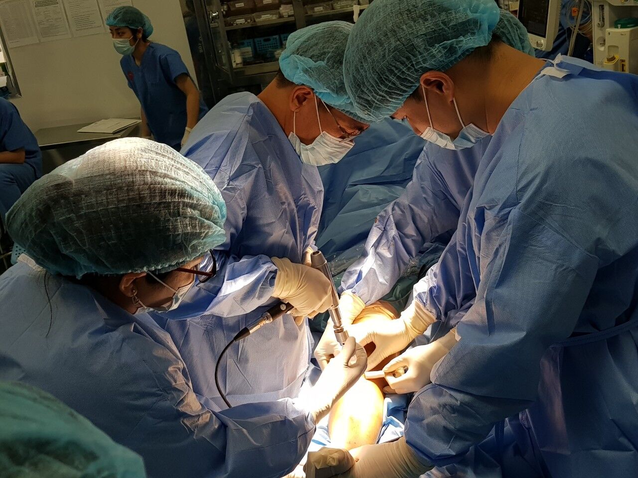 PGS.TS Lê Văn Đoàn tham gia một ca phẫu thuật kéo dài chân tại Viện Chấn thương Chỉnh hình, Bệnh viện Trung Ương Quân đội 108.