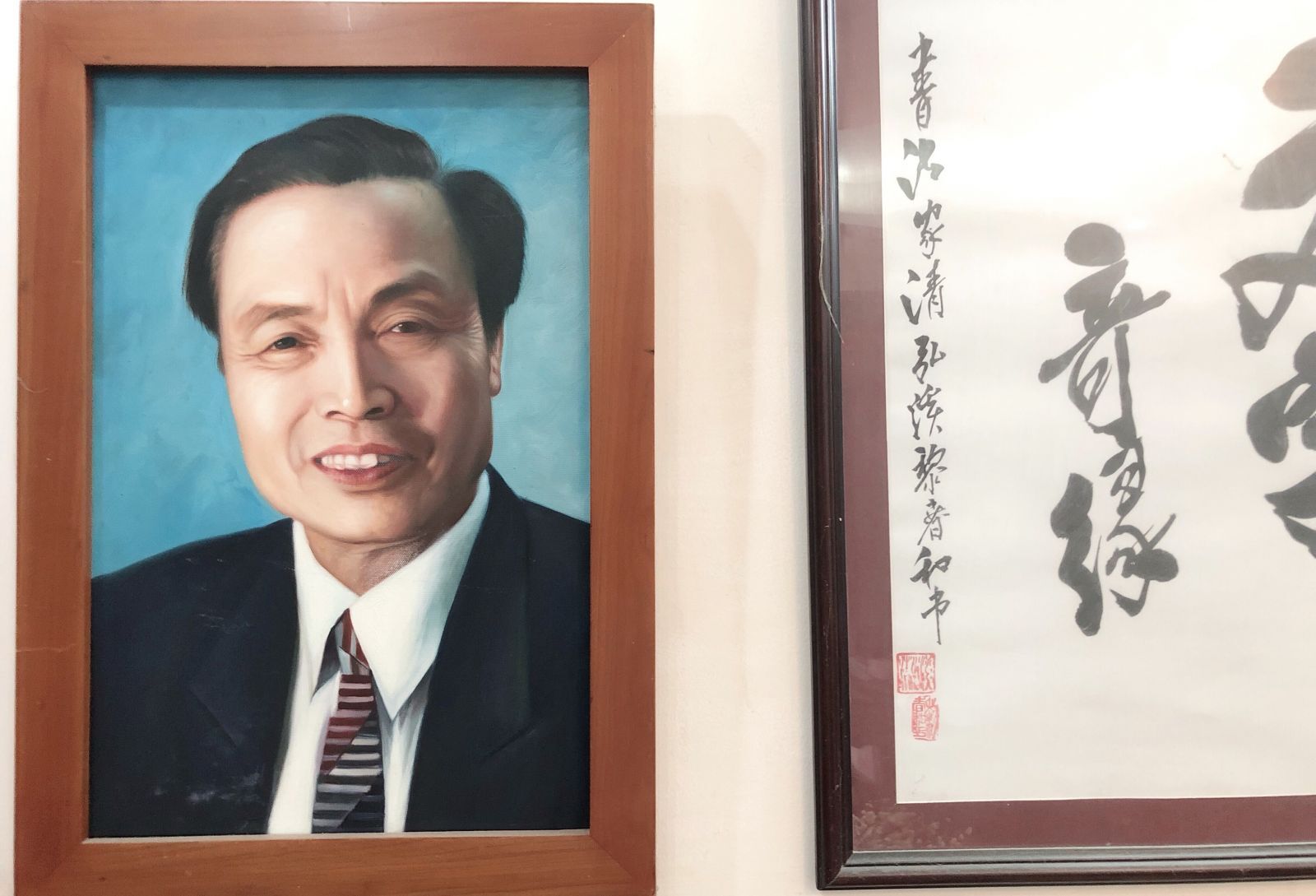 Chân dung PGS.TS Nguyễn Đình Hựu bên bức thư pháp phác họa cuộc đời ông