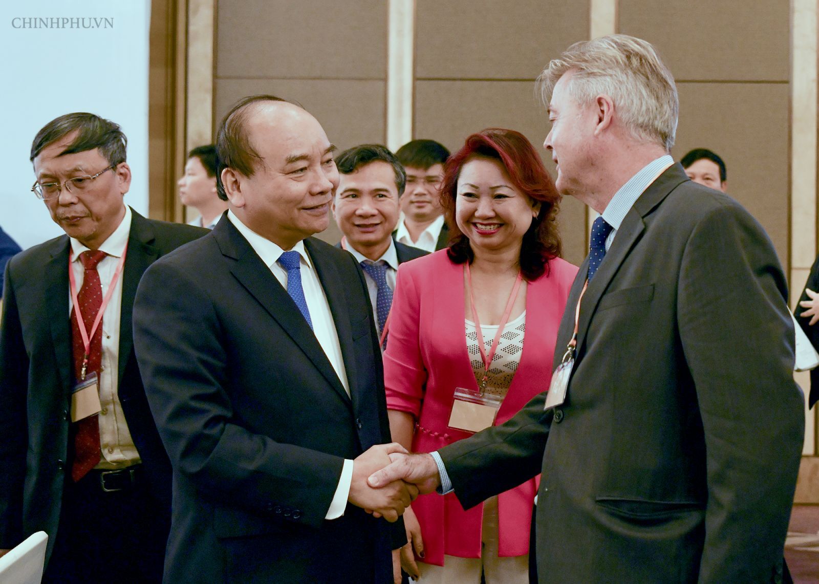 Thủ tướng trò chuyện với các đại biểu dự diễn đàn. Ảnh: VGP/Quang Hiếu.