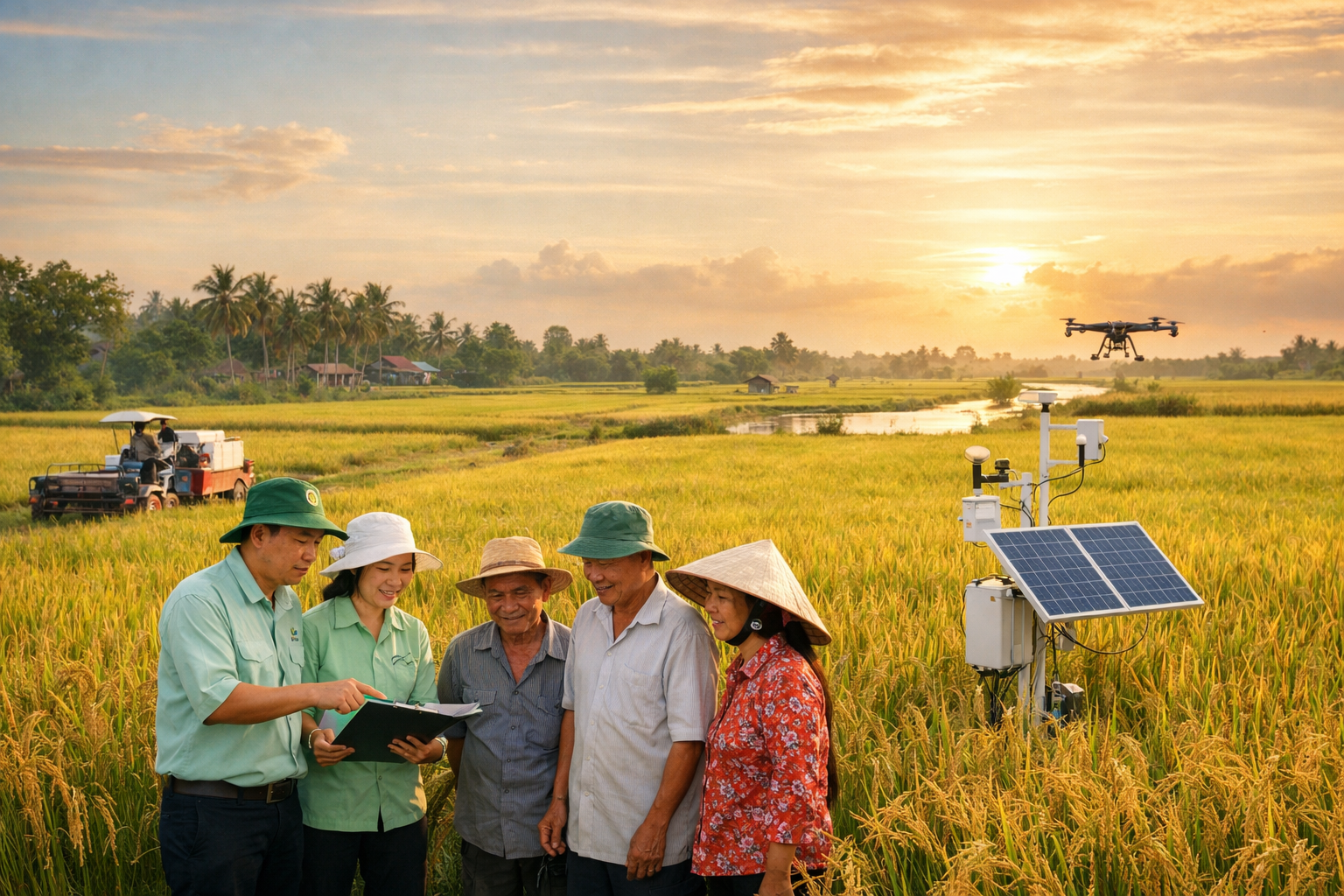 Trong bối cảnh hội nhập kinh tế quốc tế ngày càng sâu rộng và yêu cầu phát triển nông nghiệp theo hướng bền vững, ngành lúa gạo Việt Nam đang đứng trước yêu cầu phải chuyển đổi mô hình tăng trưởng từ chủ yếu dựa vào mở rộng diện tích và gia tăng sản lượng sang nâng cao chất lượng, hiệu quả và giá trị gia tăng. Cùng với mục tiêu bảo đảm an ninh lương thực, sản xuất lúa gạo hiện nay còn phải đáp ứng các tiêu chuẩn ngày càng cao về an toàn thực phẩm, truy xuất nguồn gốc, giảm phát thải khí nhà kính và thích ứng với biến đổi khí hậu. Đặc biệt tại Đồng bằng sông Cửu Long – vùng sản xuất lúa trọng điểm của cả nước – những tác động của xâm nhập mặn, thiếu nước ngọt trong mùa khô, chi phí vật tư nông nghiệp tăng cao và yêu cầu khắt khe của thị trường xuất khẩu đang đặt ra sức ép lớn đối với phương thức canh tác truyền thống. Mô hình sản xuất nhỏ lẻ, phân tán, thiếu liên kết chuỗi bộc lộ nhiều hạn chế, khiến hiệu quả sản xuất chưa tương xứng với tiềm năng, đồng thời làm gia tăng rủi ro cho người nông dân trong điều kiện thị trường biến động.