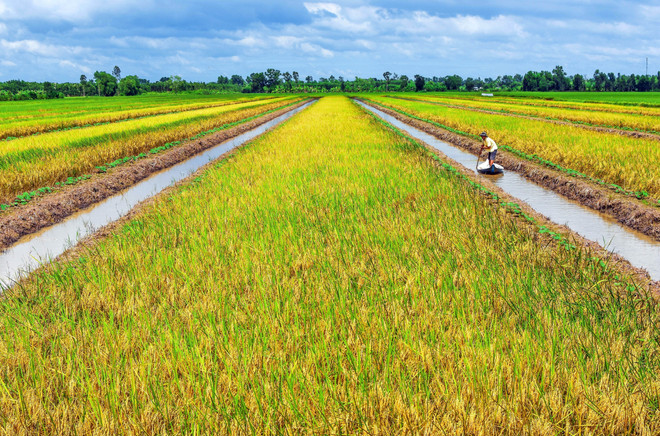 Những thảm lúa chín vàng trên vùng ngọt hóa huyện Trần Văn Thời, được đánh giá có nhiều tiềm năng về phát triển du lịch nông nghiệp. Ảnh: TTXVN