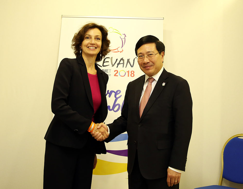 Tiếp Tổng Giám đốc Tổ chức Văn hoá Giáo dục của Liên Hiệp quốc (UNESCO) bà Audrey Azoulay, Phó Thủ tướng Bộ trưởng Phạm Bình Minh đánh giá cao sự hợp tác và hỗ trợ của UNESCO đối với Việt Nam những năm qua và bày tỏ mong muốn bà Tổng Giám đốc trên cương vị của mình tiếp tục ủng hộ Việt Nam.