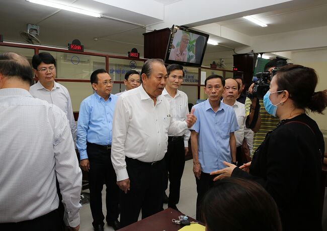 Phó Thủ tướng Thường trực Chính phủ Trương Hòa Bình cùng đoàn công tác thăm nơi tiếp nhận và giao trả hồ sơ theo quy trình một cửa của Thành phố Nha Trang, tỉnh Khánh Hòa. Ảnh: VGP/Mạnh Hùng