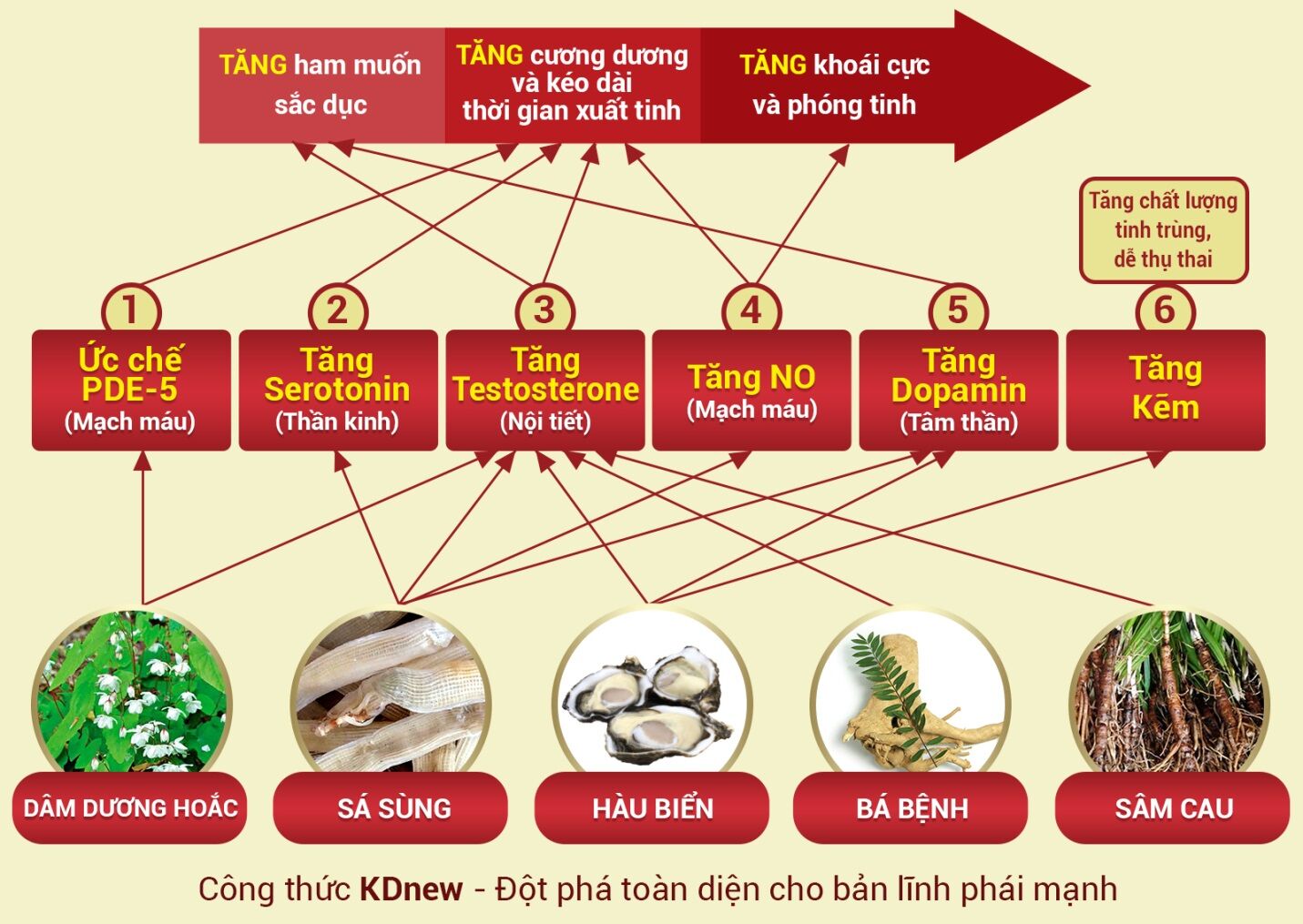 Như vậy, 2 dược liệu quý của biển cả kết hợp với 3 dược liệu vàng của núi rừng đã trở thành 5 "ngũ hổ tướng" trong công thức KDnew cùng hiệp đồng tác dụng giúp đấng mày râu tự tin duy trì phong độ vững bền
