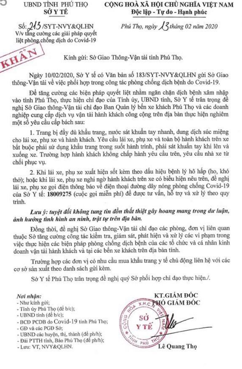 Theo đó, Công văn số 213 ngày 13/2/2020 nêu rõ, để tăng cường các biện pháp quyết liệt nhằm ngăn chặn dịch bệnh xâm nhập vào tỉnh, thực hiện chỉ đạo của Tỉnh uỷ, UBND tỉnh, Sở Y tế đề nghị Sở Giao thông- Vận tải chỉ đạo Ban quản lý xe khách và các doanh nghiệp cung cấp dịch vụ vận tải hành khách công cộng trên địa bàn thực hiện nghiêm một số yêu cầu sau: