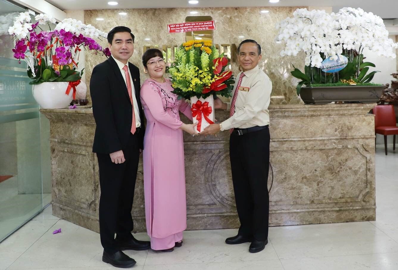 Ông Lê Hoàng Châu – Chủ tịch Hiệp hội BĐS TP. HCM (Bìa phải) tặng hoa cho Ban lãnh đạo Phúc Khang Corporation, chúc mừng ngày khai xuân.