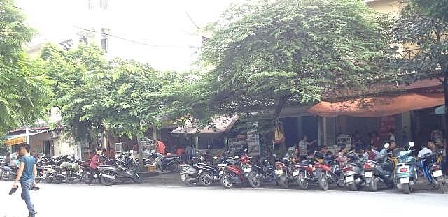 Các chủ kinh doanh tận dụng từng cm vỉa hè để bày bàn, ghế bàn hàng ăn, cà phê… dưới lòng đường thì được tận dụng để xếp xe cho khách.