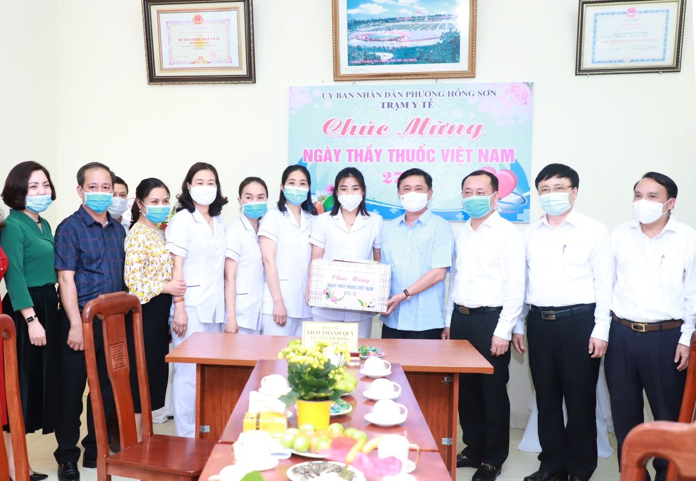 Đồng chí Thái Thanh Quý - Bí thư Tỉnh ủy và Đoàn lãnh đạo Sở y tế tặng quà động viên, chúc mừng Trạm y tế Phường đã làm tốt công tác phòng, chống dịch Covid - 19.