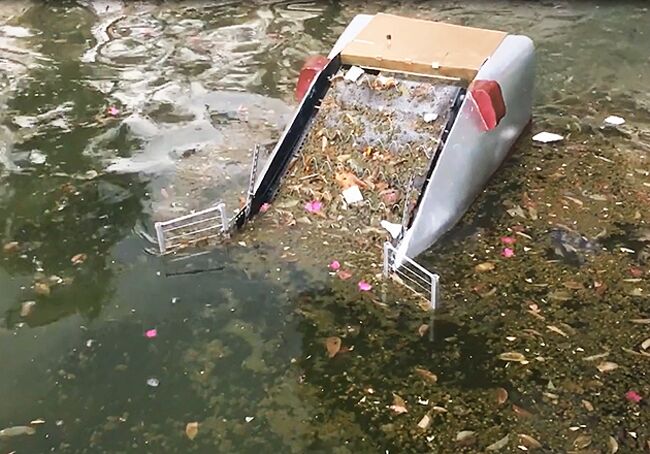 Phương tiện gom rác thủy - bộ của nhóm tác giả từ Đà Nẵng vận hành thử nghiệm trên mặt nước.