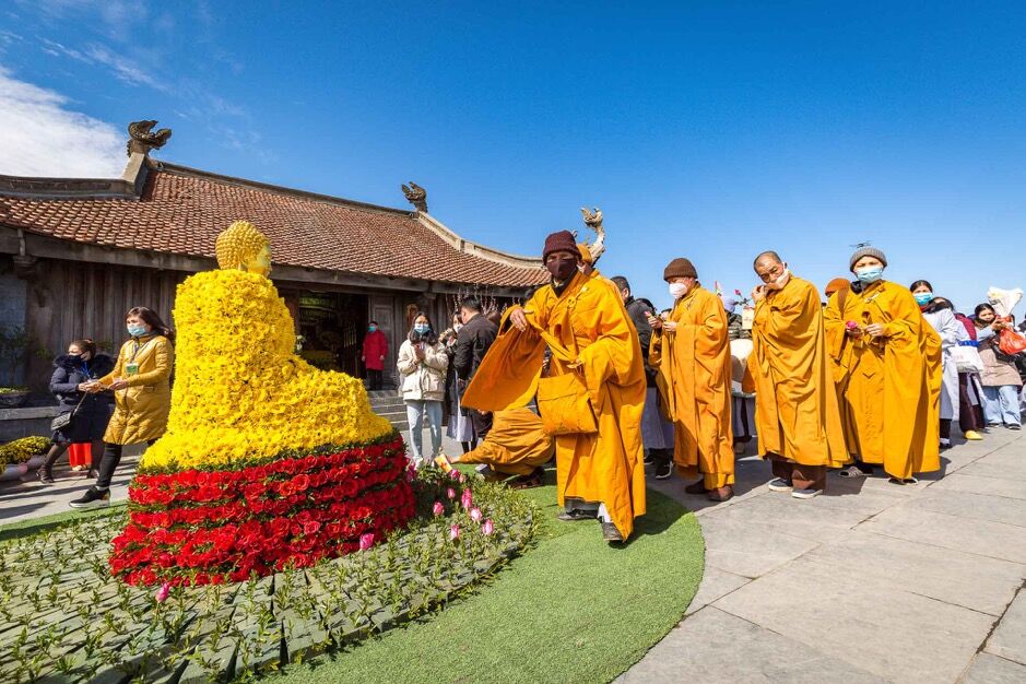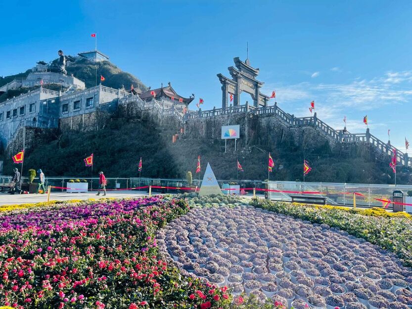 Sau lễ nguyện cầu, cabin cáp treo sẽ đưa Phật tử và du khách xuyên tầng mây để đặt chân đến “cổng trời” Fansipan. Đón chào du khách là đại cảnh Vạn hoa dâng Phật được tạo hình đoá sen khổng lồ rộng 150m2 làm từ hàng ngàn bông hoa tươi ngay giữa Sân Mây, mang đến không khí xuân tươi mới, rực rỡ.