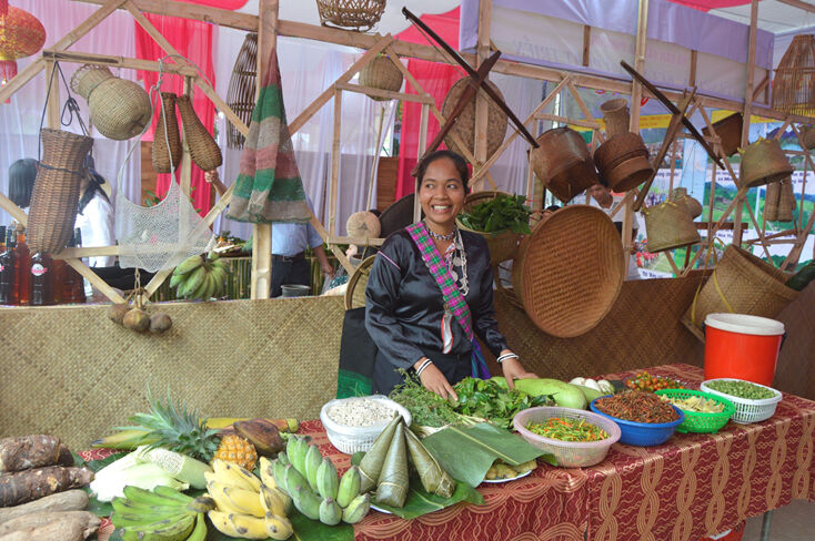 Các gian hàng giới thiệu, bán các sản vật đặc trưng của địa phương trong Hội Rằm tháng ba Minh Hóa