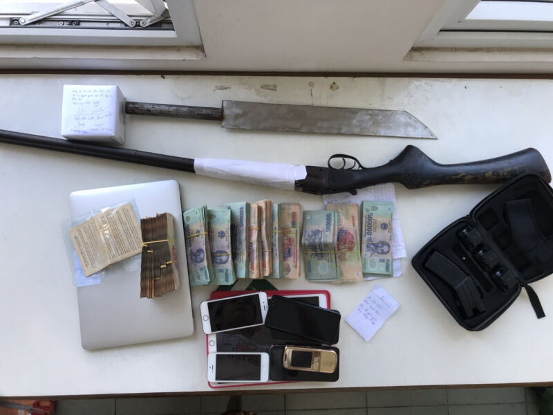 Trong quá trình khám xét nhà các đối tượng, lực lượng chức năng đã thu giữ một khẩu súng Kalipdu cùng 12 viên đạn, một súng bắn điện, sáu điện thoại di động, một laptop, một máy tính bảng, ba ô tô và 437 triệu đồng tiền mặt.