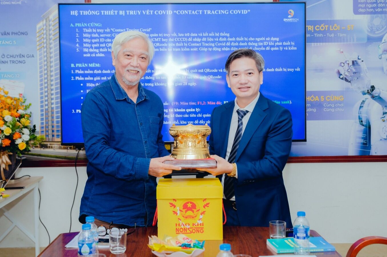 Nhà sử học Dương Trung Quốc tặng Trống đồng Đông Sơn phiên bản Hào Khí Non Sông cho ông Nguyễn Lương Phương - Chủ tịch HĐQT Smarttech Việt Nam