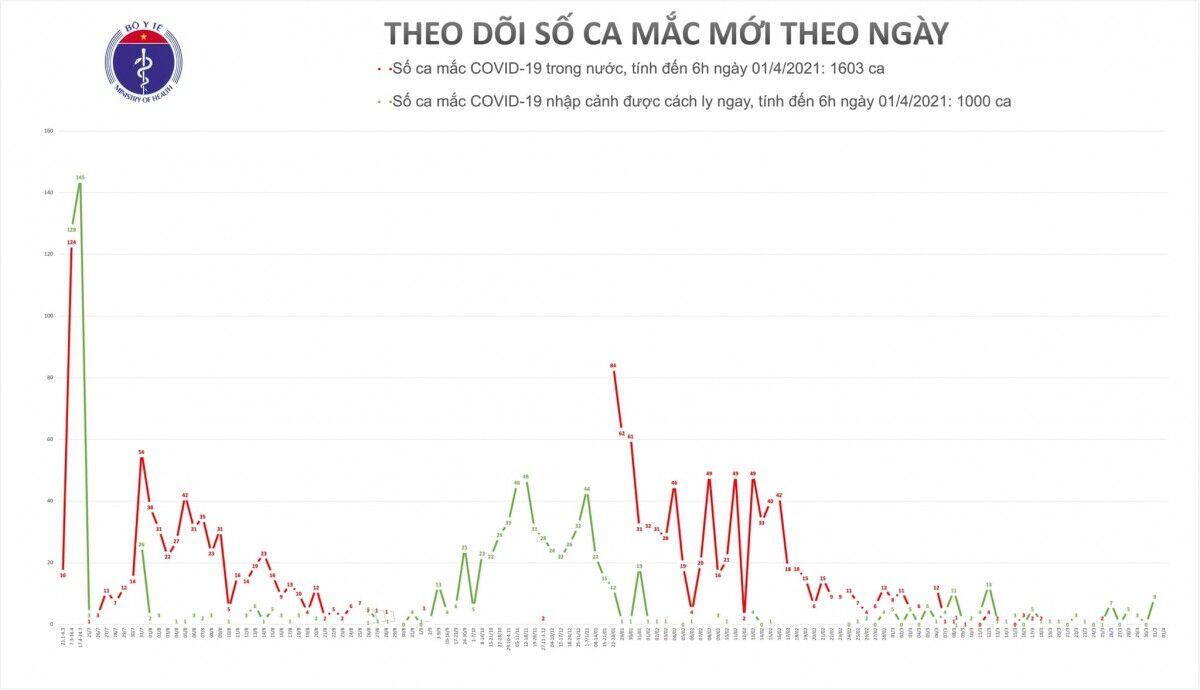 Tính đến 6h ngày 01/4: Việt Nam có tổng cộng 1603 ca mắc COVID-19 do lây nhiễm trong nước, trong đó số lượng ca mắc mới tính từ ngày 27/1 đến nay: 910 ca.