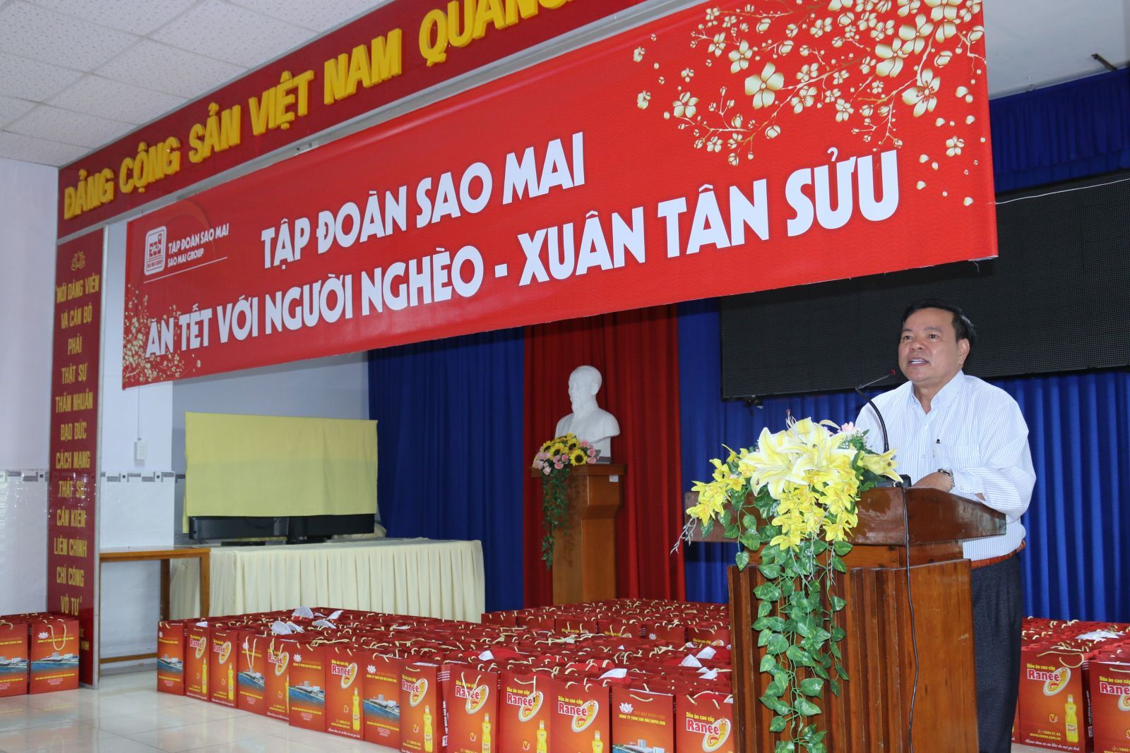 Ông Lê Xuân Quế - Phó Tổng Giám đốc Tập đoàn Sao Mai phát biểu tại buổi lễ trao quà tết cho các hộ nghèo.
