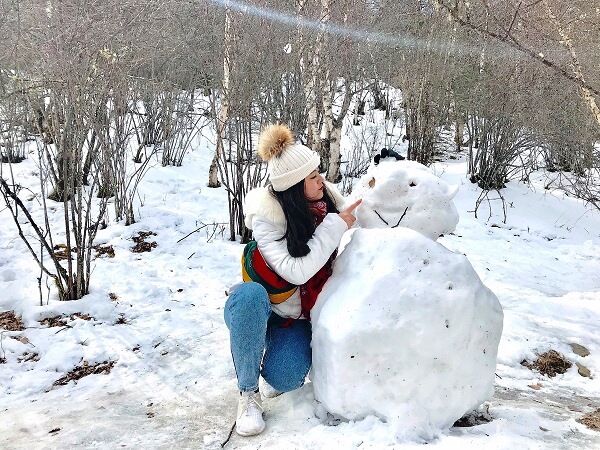 Du khách thích thú tạo dáng chụp ảnh bên người tuyết