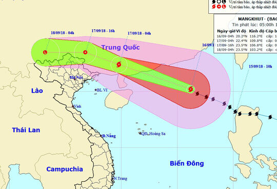 Theo Trung tâm dự báo khí tượng thủy văn quốc gia, hồi 4 giờ ngày 16-9, vị trí tâm bão số 6 (siêu bão Mangkhut) ở vào khoảng 20,2 độ Vĩ Bắc; 116,2 độ Kinh Đông, trên khu vực Đông Bắc Biển Đông, cách Ma Cao (Trung Quốc) khoảng 400 km về phía Đông Đông Nam. Sức gió mạnh nhất vùng gần tâm siêu bão Mangkhut mạnh cấp 14 (150 km/giờ), giật cấp 17. Phạm vi gió mạnh cấp 6, giật cấp 8 trở lên khoảng 350 km tính từ vùng tâm bão; Phạm vi gió mạnh cấp 10 trở lên khoảng 150 km tính từ vùng tâm bão.
