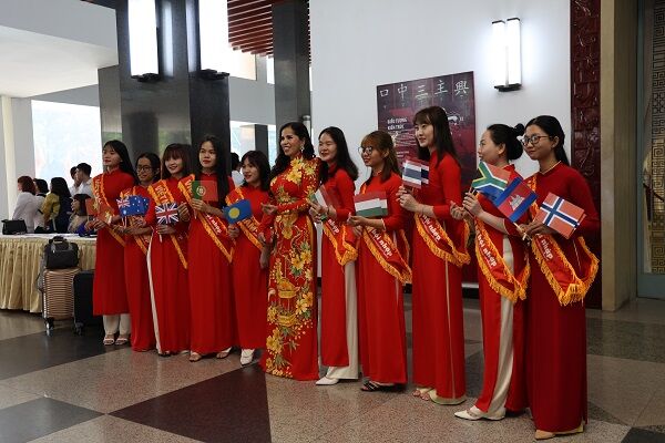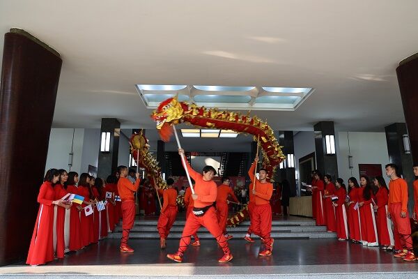 Sinh viên Đại học Bình Dương hòa chung không khí Gala Chào Xuân Việt Nam Hội nhập 2021 với những tà áo dài đỏ thắm.