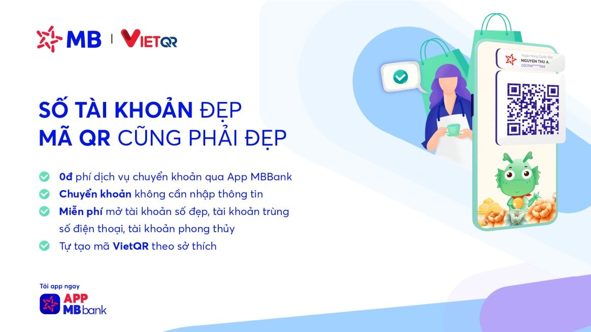 Bởi vậy, mọi khách hàng của MBBank đều có thể dễ dàng đăng ký số tài khoản theo sở thích trên App MBBank chỉ trong thời gian 5s mà không cần các điều kiện ưu tiên bắt buộc. MBBank cũng là ngân hàng tiên phong cung cấp dịch vụ mở số tài khoản trùng số điện thoại, số tài khoản tứ quý, số ngày sinh… hoàn toàn miễn phí, đã thu hút giới trẻ và tạo ra một “làn sóng” hưởng ứng tích cực trên mạng xã hội – điều mà hiếm có ngân hàng hay tổ chức tài chính nào có thể làm được. Đặc biệt, vào ngày 15/6/2021, MBBank đã chính thức ra mắt hình thức thanh toán mới bằng mã VietQR trên App MBBank. Theo đó, khách hàng có thể dễ dàng tạo một mã QR cho tài khoản thanh toán của mình để giao dịch mà không cần phải nhập các thông tin chi tiết của người thụ hưởng như số tài khoản, tên tài khoản, ngân hàng thụ hưởng… như các hình thức chuyển tiền thông thường. Giờ đây, không chỉ sở hữu số tài khoản đẹp, App MBBank còn cho phép người dùng có ngay mã QR đẹp để sử dụng. Khách hàng có thể tự lựa chọn linh vật, màu sắc theo sở thích hoặc phong thủy gắn liền mã QR theo cá tính của từng cá nhân.