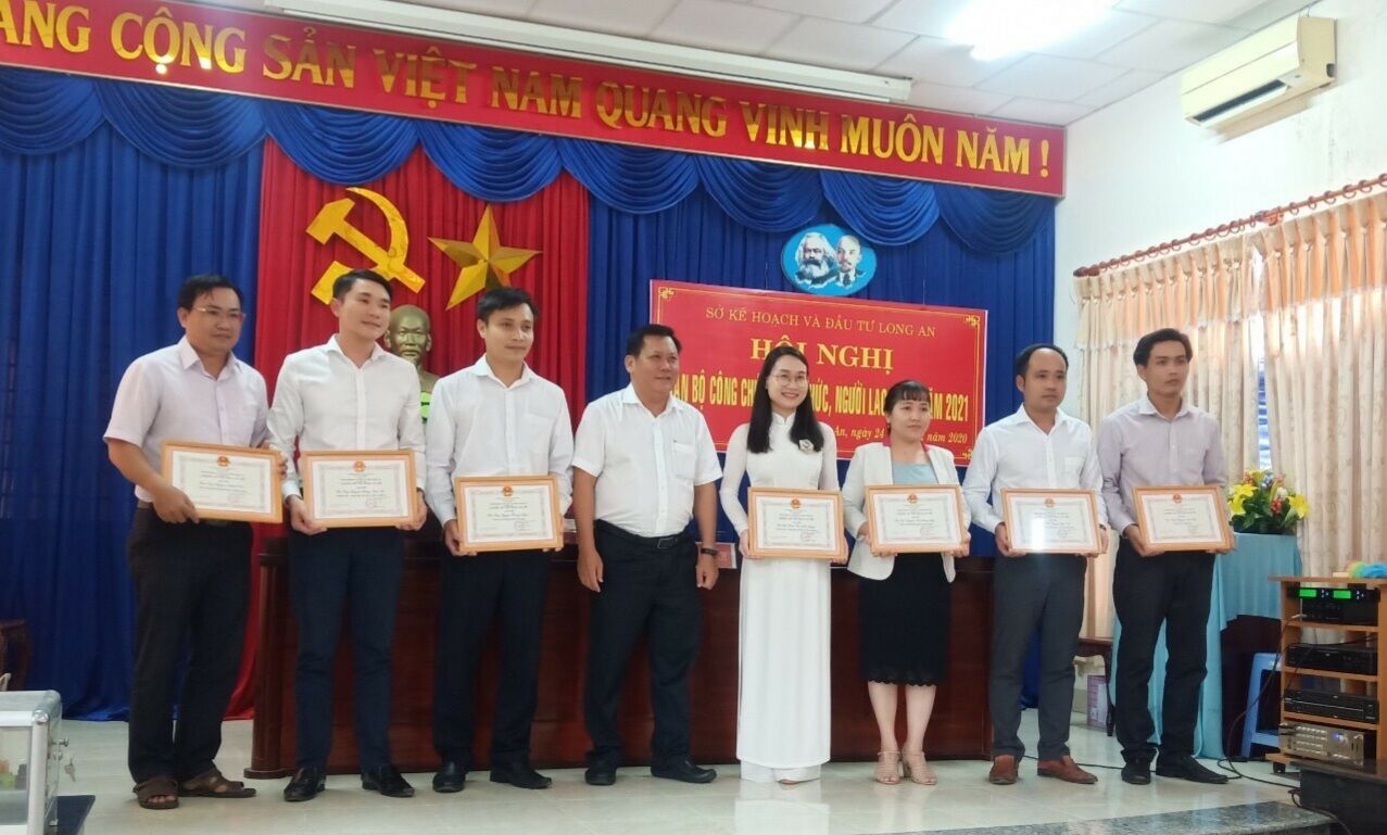 Ông Huỳnh Văn Sơn - Giám đốc Sở KH&ĐT trao giấy khen chiến sĩ thi đua cơ sở (hội nghị cán bộ công chức, viên chức, người lao động năm 2020)