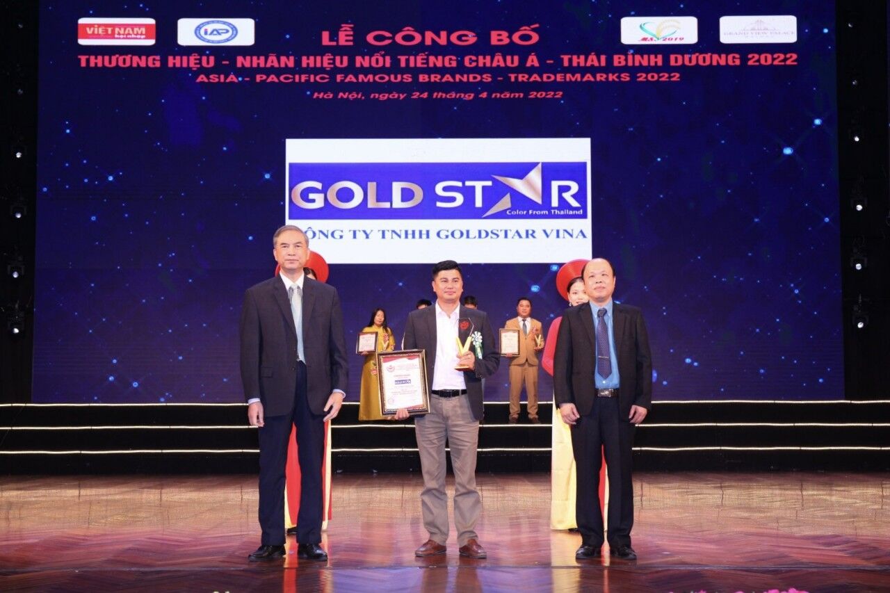 Đặc biệt ngày 26 tháng 4 năm 2022 vừa qua, tại Trung tâm hội nghị Văn phòng Chính Phủ - 37 Hùng Vương, quận Ba Đình, TP Hà Nội. Ông Trần Văn Trưởng - Tổng giám đốc công ty TNHH Goldstar Vina đại diện cho toàn thể hệ thống đã vinh dự nhận kỷ niệm chương Top 10 Thương hiệu - Nhãn hiệu nổi tiếng châu Á – Thái Bình Dương 2022, đây chính là phần thưởng xứng đáng và cũng là niềm vinh dự, đồng thời cũng là động lực để Ban lãnh đạo công ty đang từng bước đưa sơn Goldstar ngày một phát triển rực rỡ. Sự tin tưởng và ủng hộ của khách hàng trong suốt thời gian qua là nguồn động viên to lớn trên bước đường phát triền không ngừng của Goldstar. đánh dấu bước phát triển mới của Goldstar Vina.