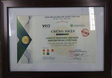 Đây là năm thứ hai liên tục Suntory PepsiCo Việt Nam được vinh danh là một trong Top 100 Doanh nghiệp bền vững do Phòng Thương mại và Công nghiệp Việt Nam (VCCI) phối hợp với Bộ Công thương, Bộ Lao động-Thương binh và Xã hội, Bộ Tài nguyên và Môi trường, Tổng Liên đoàn Lao động Việt Nam, Uỷ ban Chứng khoán Nhà nước tổ chức.