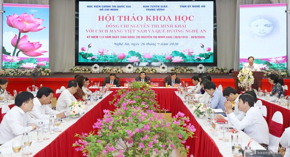 VNHN - Sáng 26/9, tại thành phố Vinh (Nghệ An), Học viện Chính trị quốc gia Hồ Chí Minh phối hợp với Ban Tuyên giáo Trung ương và Tỉnh ủy Nghệ An tổ chức Hội thảo khoa học "Đồng chí Nguyễn Thị Minh Khai với cách mạng Việt Nam và quê hương Nghệ An" nhân kỷ niệm 110 năm Ngày sinh đồng chí Nguyễn Thị Minh Khai (30/9/1910 - 30/9/2020).