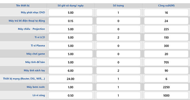 Trên trang web này, khách hàng sẽ cung cấp các thông tin về số lượng, chủng loại thiết bị điện gia đình đang sử dụng, bao gồm: Thiết bị cơ bản (như bếp điện, tủ lạnh, đèn chiếu sáng…), thiết bị tiêu thụ nhiều điện (như điều hòa nhiệt độ, máy giặt, máy sấy quần áo, lò nướng…). Cùng với đó, cung cấp dữ liệu về tần suất, mức độ, thói quen sử dụng các thiết bị này.
