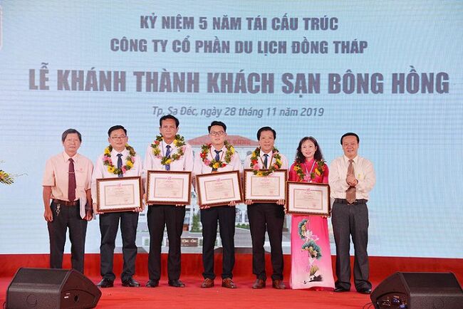 Dịp này, Tập đoàn Sao Mai và UBND tỉnh Đồng Tháp tặng nhiều bằng khen, giấy khen cho các tập thể, cá nhân đạt thành tích xuất sắc kinh doanh trong 5 năm của giai đoạn tái cấu trúc Công ty Cổ phần Du lịch Đồng Tháp.