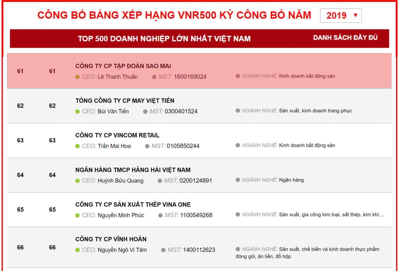 Sao Mai nằm trong danh sách Top 100 doanh nghiệp lớn nhất Việt Nam 2019.