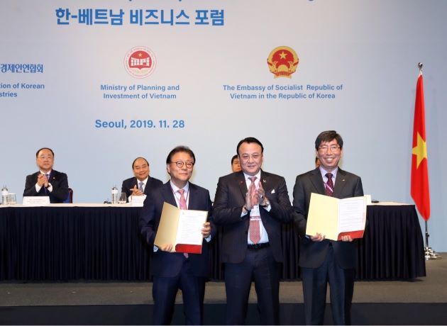 Thủ tướng Chính phủ Nguyễn Xuân Phúc (ngồi thứ 2 từ trái sang) và đại diện Chính phủ Hàn Quốc chứng kiến Lễ ký kết hợp tác liên doanh giữa Tân Hoàng Minh và các đối tác.
