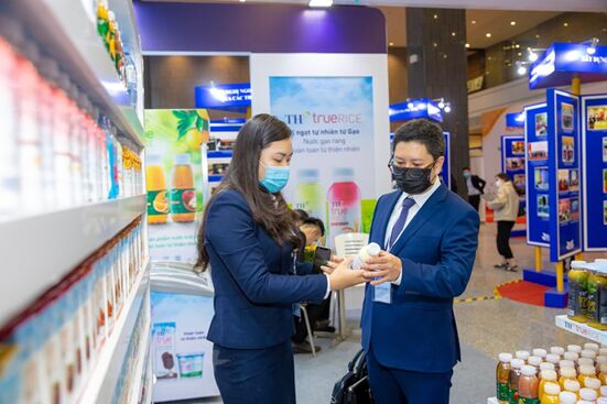 Gian hàng TH true MILK cũng vinh dự tiếp đón Bộ trưởng Bộ Ngoại giao Bùi Thanh Sơn ghé thăm. (Ảnh: PV/Vietnam+)