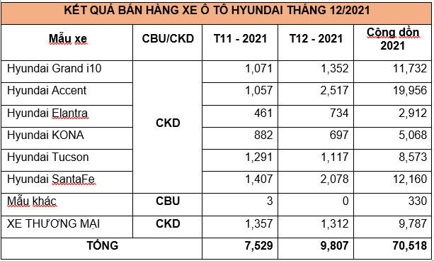Hà Nội ngày 10/01/2022, Tập đoàn Thành Công thông báo kết quả bán hàng tháng 12/2021. Theo đó, tổng doanh số xe Hyundai tháng 12 đạt 9.807 xe, tăng trưởng 30,2% so với tháng 11, đưa tổng doanh số bán hàng xe Hyundai của năm 2021 đạt 70.518 xe.
