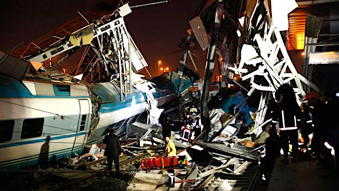 VNHN - Sáng ngày 13/12 (theo giờ địa phương), một đoạn tàu cao tốc đã va chạm với một đầu kéo xe lửa sau đó đâm vào cầu vượt tại một ga tàu ở Thủ đô Ankara, Thổ Nhĩ Kỳ. Giới chức địa phương cho biết, cú va chạm mạnh đã làm bốn người chết và 43 người khác bị thương.