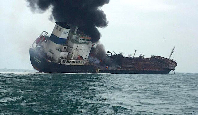Cận cảnh tàu chở dầu bốc cháy ngoài khơi Hong Kong. Ảnh: SCMP