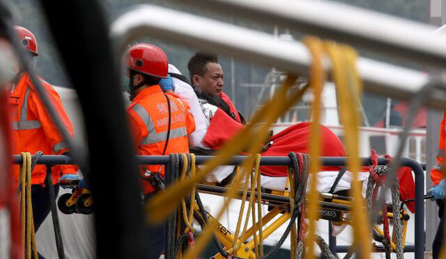 Lực lượng cứu hộ đưa những người bị thương tới bệnh viện sau khi tàu bốc cháy. Ảnh: SCMP