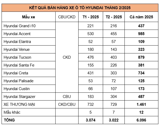 Doanh số bán hàng các mẫu xe Hyundai trong tháng 2/2025 (Đơn vị: Xe)