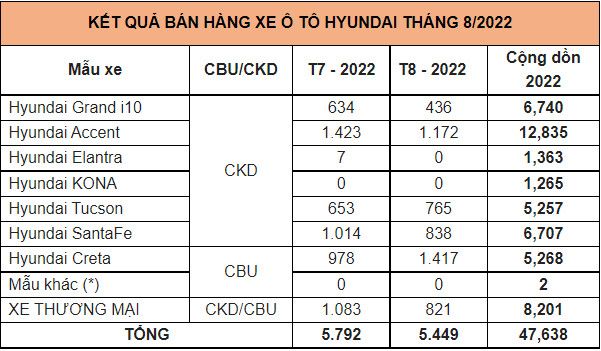 Hyundai Creta là mẫu xe có số lượng bán hàng tốt nhất tháng 8 với 1.417 chiếc đến tay khách hàng, tăng 44,9% so với tháng 7/2022. Hyundai Accent đứng ở vị trí thứ 2 với 1.172 chiếc và Santa Fe đứng ở vị trí thứ 3 với 838 chiếc. Hyundai Tucson tiếp tục giữ phong độ ổn định với 765 chiếc bán ra, tăng 17,1% so với tháng 7.